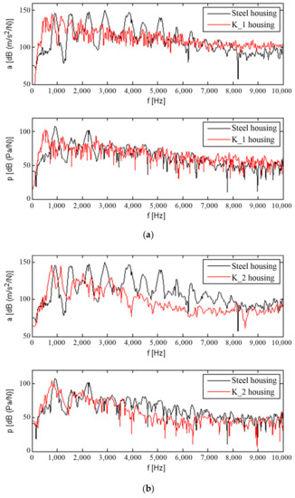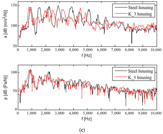 Comparison of averaged vibration acceleration (a) and sound pressure (p) of composite housings and steel housing: (a) Steel housing-K_1 housing, (b) Steel housing-K_2 housing, and (c) Steel housing-K_3 housing.