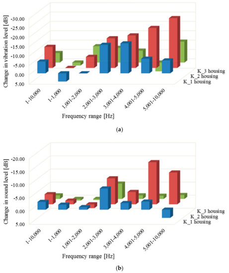 Change in the vibration (a) and sound (b) levels of composite housings K_1–K_3, relative to the steel housing.