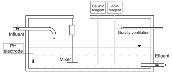 The described neutralisation tank operates in the batch mode. The chemical composition of the effluents that are being neutralised is variable over time and depends on the actual research and production program in the pharmaceutical laboratory. Effluents are pumped into the chamber where an electrode measures their pH. On that basis effluents are evaluated in terms of their compliance with the set point (neutral pH value). If the pH value is out of range, chemical pumps inject an acid or caustic reagent solution as required to bring the effluent to the correct level. The agitator keep the contents of the tank mixed, so the pH probe is always measuring a representative sample of the effluent and the added reagents are quickly distributed within the tank. For the caustic reagent solutions of caustic soda (NaOH, Chempur, Piekary Slaskie, Poland) are used. For the acid reagent a solution of sulphuric acid (H2SO4, Chempur, Piekary Slaskie, Poland) is used. A schematic method diagram of the described neutralization in the tank is shown on the Figure 1.