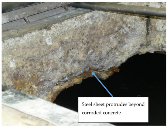Tests were conducted on the operating tank. The lateral surfaces of the ceiling slab well visible in the manhole openings were highly corroded. The loss of concrete ranged from a dozen mm up to more than 20 mm. The folded sheet in the cutting location was also corroded. However, the corrosion rate was lower. Approximately 20 mm of sheet protrudes beyond the corroded concrete (Figure 2).