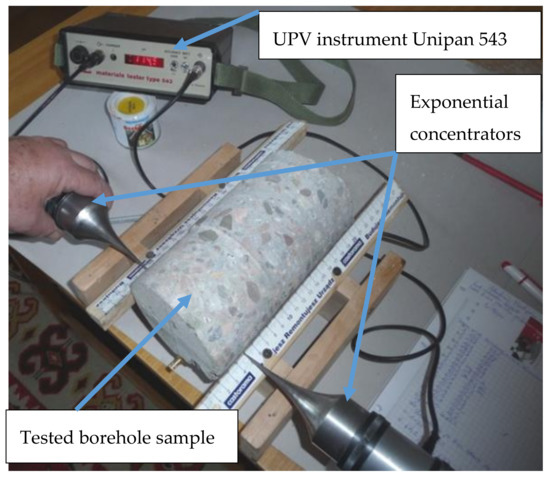 The tests were performed with a UNIPAN 543 (Zaklady Aparatury Naukowej UNIPAN, Warsaw, Poland) ultrasonic pulse velocity (UPV) test instrument (Figure 5). Probe concentrators were applied from the two opposite sides of the examined concrete cylindrical samples, in planes parallel to the surface of the wall they were bored from. In that way the longitudinal wave velocities were measured.
