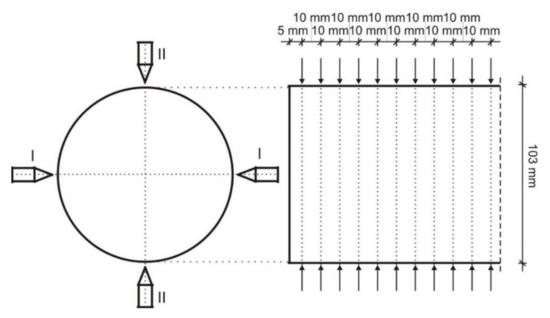 The ultrasound rate was determined in two directions approximately perpendicular to each other, along the diameters, in planes located 10 mm from each other. Only the distance of the first measurement point from the external surface of the wall was 5 mm (Figure 6).
