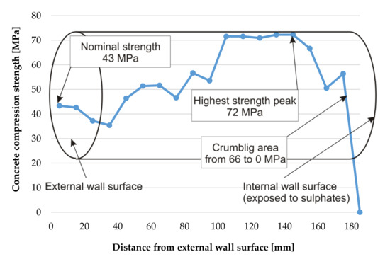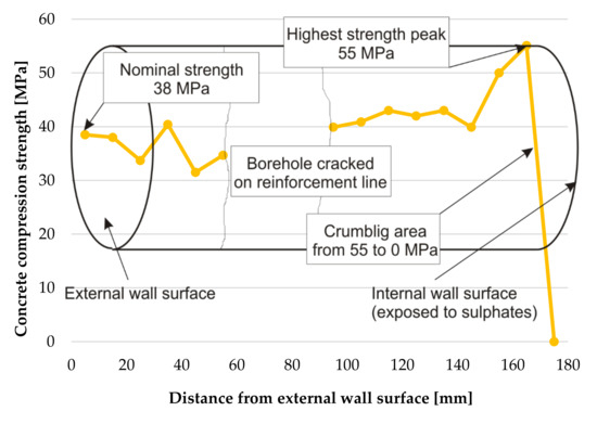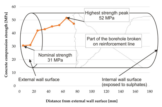 Values of compressive strength of the samples taken from the tank walls show an increase in strength from 30–43 N/mm2 in the cross sections near the external, unexposed wall layers to 55 and 72 N/mm2 in the internal (exposed) cross sections of the walls. For the tested samples, this gives an increase in strength of 44% to 83% from its initial strength measured in the cross sections near the unexposed side of the structure. Sulphuric acid ions react with the cement compounds and the formation of gypsum leads to an increase in volume [17,18,50]. No destructive expansion of concrete takes place at this stage, and a reasonable conclusion can be drawn that the filling of pores and spaces in concrete by the calcium sulphate dihydrate causes a significant increase in the strength of the concrete, as has been shown in Figure 11. The compressive strength of the concrete samples decreases suddenly in the inner cross sections of the walls, when the salt crystallization pressure exceeds concrete tensile strength. In this stage of corrosion gypsum stone reacts with tricalcium aluminates (C3A) and hydrated calcium sulfoaluminate (monosulphate) and forms the final chemical product Candlot’s salt what is associated with spalling and cracking in the surface zone of tested elements, and has been described in [51,52,53]. The completed tests confirmed that the drop of compressive strength took place only near internal cross-sections of the tested samples, within a distance not greater than 10 mm from their exposed surface. In the future, it is planned to carry out measurements of ultrasonic wave velocity and strength distribution in the tank walls at the height at which they are immersed in the corrosive substance and to compare them with the results presented in this article.