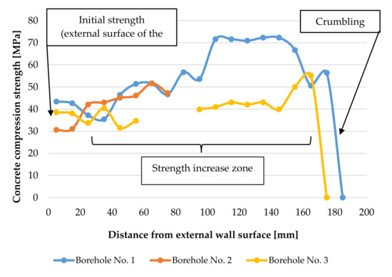 - In the presented research, the difference in concrete strength between cross sections near the exposed and unexposed sides varied from an increase of 44% (borehole No. 3) to 83% (borehole No. 1).