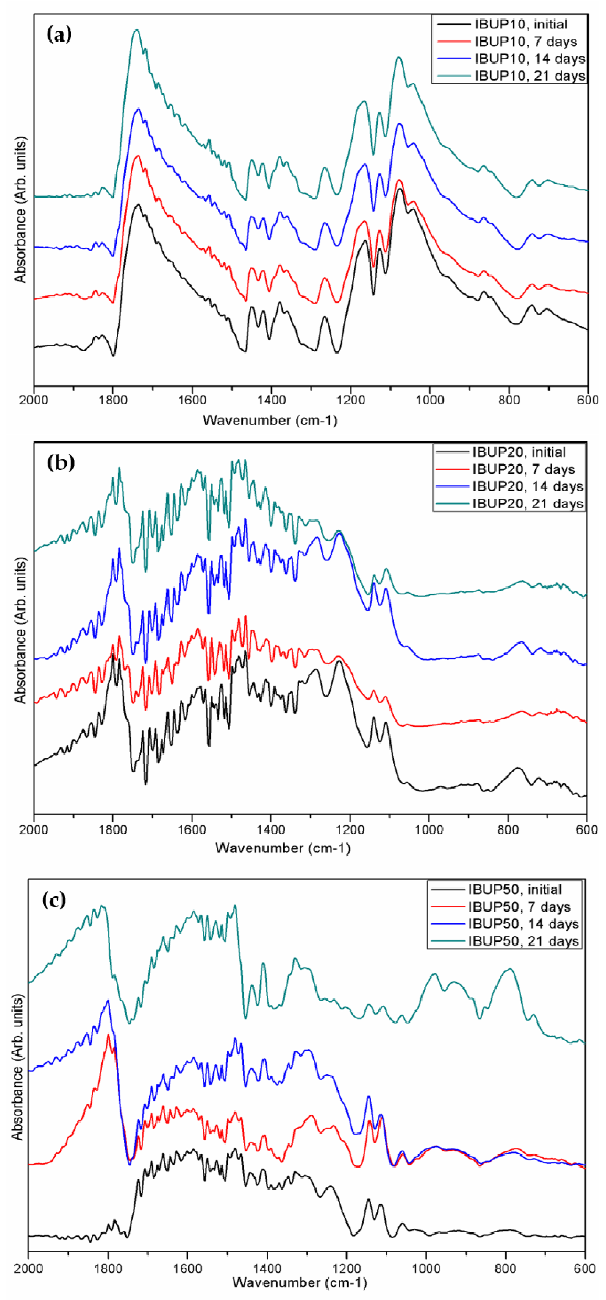 - Vey, E.; Rodger, C.; Booth, J.; Claybourn, M.; Miller, A.F.; Saiani, A. Degradation kinetics of poly(lactic-co-glycolic) acid block copolymer cast films in phosphate buffer solution as revealed by infrared and Raman spectroscopies. Polym. Degrad. Stabil. 2011, 96, 1882–1889. [Google Scholar] [CrossRef]