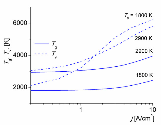Gas and vibrational temperatures calculated at various values of T0 versus the discharge current density is given in Figure 1. The gas and vibrational temperatures increase with j. For j > 1 A/cm2 the values of Tv are larger at smaller T0, thus increasing the non-equilibrium state of the discharge. This is expected since the rate of V-T energy relaxation increases strongly with the gas temperature. The same trend is shown in [23]. Over the mean-convective transport time (τ ≈ 33 μs) the gas at T0 = 1800 K is heated by about 300 K for j = 5 A/cm2, due to an incomplete V-T energy relaxation. Note under these specific conditions, the timescale of the V-T energy relaxation of N2(X1∑g+, v) molecules on O(3P) atoms collisions is τVT ≈ 86 μs. The major source of gas heating, however, is the V-T relaxation of nitrogen molecules. The E-T energy relaxation does not play a relevant role under these conditions (i.e., ηT + ηV ≈ 1 [15,34]) The Te values (not shown) softly decreases while the discharge current density (and gas temperature) increases; with values around 9000 K, typical of this kind of low-current discharges in molecular gases [20,21,22,23,24].