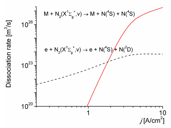 Figure 2 shows a comparison between the electron-impact dissociation from all the vibrational levels of N2(X1∑g+, v), with the thermal dissociation for vibrational excited molecules for T0 = 1800 K. As it can be seen, the thermal dissociation, stimulated by vibrational non-equilibrium, dominates over the electron-impact dissociation for j > 2 A/cm2; being the dominant mechanism in the production of N(4S) atoms under the conditions considered.