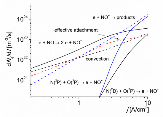 It is seen in Figure 4 that the contribution of NO molecules to ionization processes via reaction (R3) is significant because of their relatively low ionization energy (9.27 eV). This result agrees with the inferences made in [23,24,25]. However, the accumulation of N(2P) metastable atoms for current density values higher than 3 A/cm2, significantly speeds up the ionization kinetics of the discharge; mainly via the following reactions: