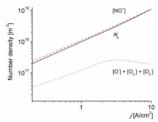 Figure 5 shows the number density of the charged particles in the discharge versus the discharge current density for T0 = 1800 K. For j = 2 A/cm2 the electron number density is Ne ≈ 2 × 1018 m-3, in good agreement with the estimate in [23,24]. It is also observed that the electron number density increases by one order of magnitude when the applied current density is increased by one order of magnitude. This trend is consistent with the estimations in [13]. The total number density of negative ions decreases with j, due to the accumulation of O(3P) atoms resulting in an increase in the detachment rate.