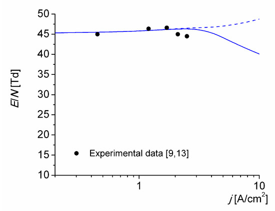 The reduced electric field (1 Td ≡ 10−21 V m2) versus the discharge current density is shown in Figure 6, both measured in [9,13] and obtained by simulation for T0 = 1800 K. Curves are the results of calculations, with (solid line) and without (dashed line) associative ionization reactions (R14)–(R16) and (R18). The reduced electric field given by the solid line follows the changes in the ionization mechanisms shown in Figure 4. It begins to appreciably decrease at current density values higher than 3 A/cm2 (i.e., when the reaction (R18) begins to significantly contribute to the ionization kinetics of the discharge) because the electron energy (6.2 eV) required for the excitation of the N2(A3∑u+) state is considerably lower than the ionization energy (9.27 eV) of the NO molecules. The calculated reduced electric field values considering the ionization reactions in metastable atomic collisions are seen to be in fairly good agreement with the experimental data over one order of magnitude in current density.