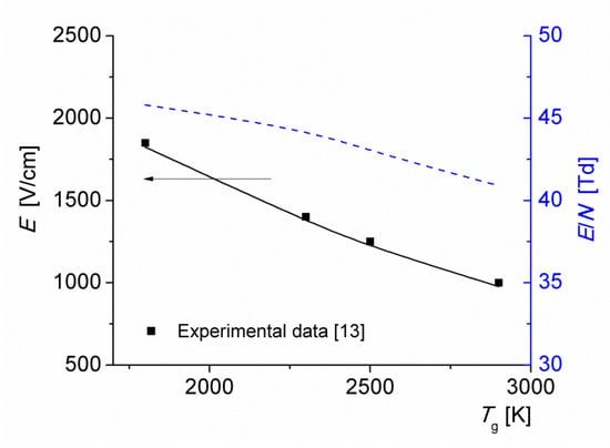 Figure 7 shows the average electric field and the reduced electric field versus the initial gas temperature of the discharge T0 = 1800–2900 K, for a current density j = 1 A/cm2. The results of calculations are in good agreement with the experimental data [13]. Note that the reduced electric field depends weakly on the gas temperature: as T0 increases from 1800 to 2900 K, the reduced field decreases from 46 to 41 Td. The decrease is caused by the formation of NO molecules with low–ionization energy (note from Figure 4 that at j = 1 A/cm2, the main ionization process is via the reaction (R3)). This agrees with the results of calculations performed in [24,25].