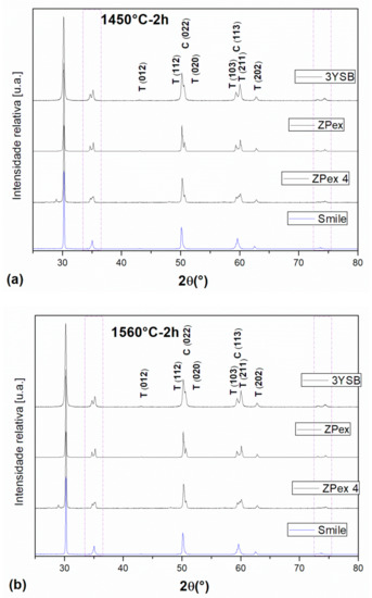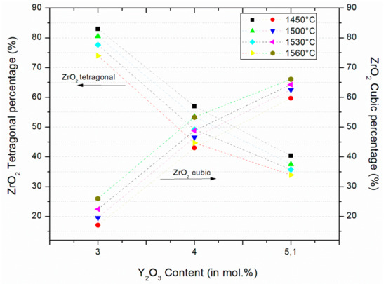 On the other hand, comparing the influence of the variation in the Y2O3 content (from 3–5.2 mol %) in the composition of the different zirconia, the variations of the percentage of phases were between 40% and 43% among the sintered samples at the same temperature. This result indicates that the influence of yttria content in the percentages of the phases is significant.