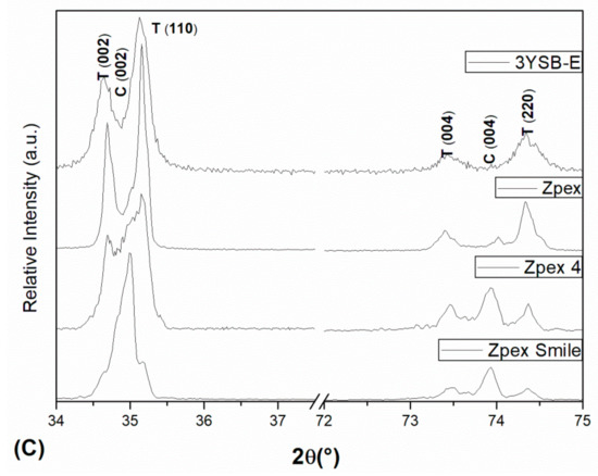 When comparing the tetragonal phase percentage of sintered 3Y-SBEat different temperatures, it can be observed that the sintered samples at 1450 °C showed the highest percentage of tetragonal phase. The samples sintered at 1560 °C showed the lowest percentage of tetragonal phase. The gap between the highest and the lowest percentage was 9%. For the other groups of zirconia, the differences between the gaps of tetragonal phase after sintering were from 6–10%, as a function of sintering temperature. This result indicates that only the sintering temperature is not statistically significant to modify the relationship between the percentages of tetragonal and cubic phases.