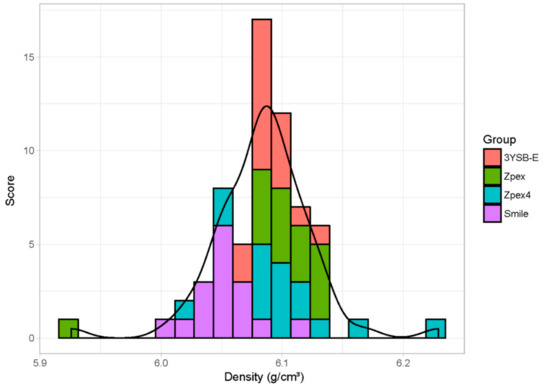 Figure 3 the dispersion of the apparent density obtained for each type of zirconia after sintering. The dispersion occurs both within groups and within sintering temperatures, which allows separating the effects of density and sintering temperature in the transmittance of the material.