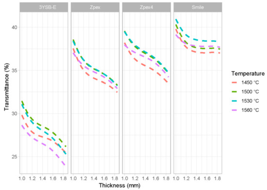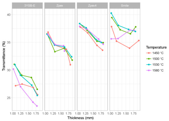 Figure 4, the transmittance results are presented as a function of sintering temperature, zirconia type, and thickness. On the