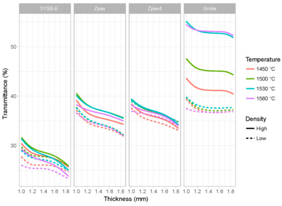 For the Zpex-Smile group, the higher sintering temperature and high density generates a zirconia with higher transmittance. For the other types of zirconia, the density also affects the transmittance. However, the partial effect is clearly lower. In addition, it is possible to verify that for the Zpex-Smile zirconia, there is less influence of the sample thickness regardless of density level. However, for the other types of zirconia, the influence of sintering temperature is still approximately linear.