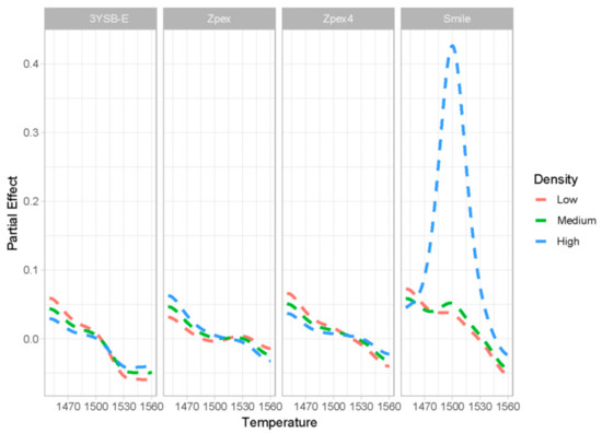 Figure 8 shows the partial influence of the sintering temperature variation on zirconia transmittance. For each group, results were estimated for low-, medium-, and high-density samples. The objective of analyzing the three densities was to verify quantitatively how the density affects the partial effect of the sintering temperature in transmittance. It can be observed that for all zirconia groups, the partial effect starts positive, i.e., as the sintering temperature increases, the transmittance increases (the partial effect is above zero). This result corroborates other works in the literature [