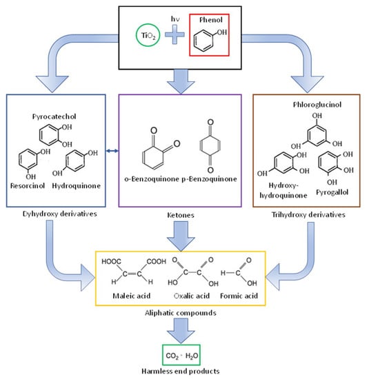 - Grabowska, E.; Reszczynska, J.; Zaleska, A. Mechanism of phenol photodegradation in the presence of pure and modified-TiO2: A review. Water Res. 2012, 46, 5453–5471. [Google Scholar] [CrossRef]