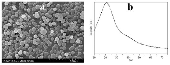 Typical SEM micrograph (a) and XRD diffractogram (b) of the obtained carbon spheres.