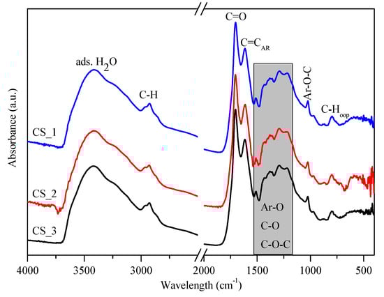 IR spectra of carbon spheres purified with increasing amounts of acetone (CS_1 < CS_2 < CS_3, respectively) by membrane filtration.