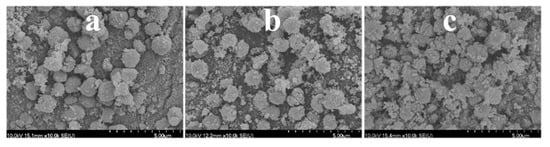 SEM micrographs of the H2_HS_2 (a), H2_HS_3 (b), and H2_HS_4 (c) samples (synthesized by the application of membrane filtered carbon spheres using increasing amounts of acetone/water, respectively) after calcination.