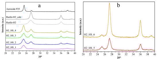 The quality of HSs was mostly uniform, which is in good accordance with the IR results, since the features of the CSs’ surface were generally identical. At this point, the crystallinity of the as-prepared TiO2 HSs, and reference photocatalysts (Evonik Aeroxide P25, Rutile-H2, and Rutile-H2_calc) was determined by XRD measurements (Figure 7a). The crystal phase distributions and average primer particle sizes are presented in Table 2. Samples H2_HS_1-4 contained predominantly anatase (1 0 1) phase (main diffraction peak at 25.6 2θ°). The size of the primer crystallites, which were the building elements of the hollow structures, varied between 9.3 and 15.0 nm. Reference photocatalysts Rutile-H2 (D = 7.3 nm) and Rutile-H2_calc (D = 14.1 nm) contained only rutile (1 1 0) (main diffraction peak at 27.2 2θ°). The size increase (and concurrent considerable loss of specific surface area) of Rutile-H2_calc can be explained by the result of calcination. Commercial Aeroxide P25 contained 90 wt% anatase and 10 wt% rutile (Danatase = 25.4 nm and Drutile = 40 nm).