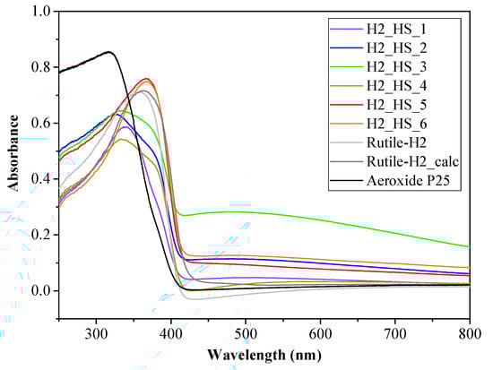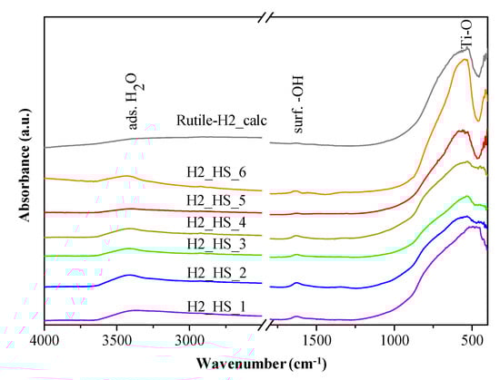 The light absorption of the TiO2-s was determined by diffuse reflectance spectroscopy (DRS). As it can be seen in Figure 9, the TiO2 HSs possess greater light absorption in the visible light region compared to reference Rutile-H2 and Aeroxide P25. The band gap energies determined from the derivative DR spectra were 3.14, 3.14, 3.15, 3.13, 3.13, and 3.13 eV for H2_HS_1-6 photocatalysts, and 3.11, 3.09, and 3.11 eV for Rutile-H2, Rutile-H2_calc, and Aeroxide P25, respectively. Based on the DRS results, samples H2_HS_1–6 possess very similar values, thus possible differences in their photocatalytic activity presumably will not be attributable to their band gaps. Surface properties of TiO2 HSs were characterized by FT-IR spectroscopy (Figure 10). In the FT-IR, a spectrum with a broad band centered at 3400 cm−1 with a sharp band at 1630 cm−1 was observed, which can be associated with the stretching and bending vibrations of the surface OH groups [58,59]; moreover, the bands around 480 and 540 cm−1 correspond to Ti–O bond [56]. The shape of these latter bands in this region varied in accordance with the different crystal phases; anatase had less defined Ti–O stretch band as it possesses less ordered structure (compared to rutile); consequently, in the case of mixed crystal phases, the infrared absorption bands also represented this transmission between the two crystal phases [60].