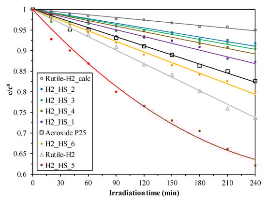 - The above listed observations emphasize the fact that, as the carbon was more efficiently eliminated from the samples (shown by the lower carbon content and higher amount of oxidized carbon species), the photocatalytic activity was higher (sample H2_HS_6 possessed only 52.6% of the photocatalytic activity of sample H2_HS_5), because in the case of the samples with lower photocatalytic activity, the surface available for the photocatalytic process could be partially blocked and therefore more hydrophobic as well. Simultaneously, if the ratio of the O–C=O in the surface deposited carbon was higher, again supports the observed activity increase, since polar functional groups facilitate the direct contact between water (the matrix of the photocatalytic process) and the surface of the photocatalyst.