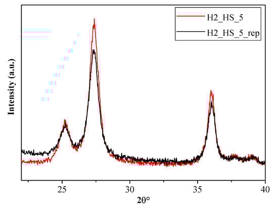 XRD diffractograms of H2_HS_5 before and after the 3 consecutive phenol degradation tests (H2_HS_5_rep).