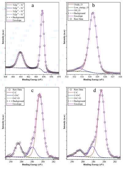 For the X-ray photoelectron spectroscopy (XPS) measurements a Specs Phoibos 150 MCD type device was used. The apparatus included the following parts: a hemispherical analyzer, a monochromatic Al-Kα source (1486.6 eV) at 14 kV and 20 mA, and a charge neutralization device. For the measurements the samples were installed on double-sided carbon tapes. The applied settings during the process were as follows: X-ray source, 200 W, and the pressure in the analysis varied between 10−9–10−10 mbar. The binding energy scale was charge referenced to the C1s at 284.6 eV. Analyzer pass energy of 20 eV in steps of 0.05 eV was applied to obtain high resolution Ti2p and O1s spectra. CasaXPS software was used for the evaluation of the data.