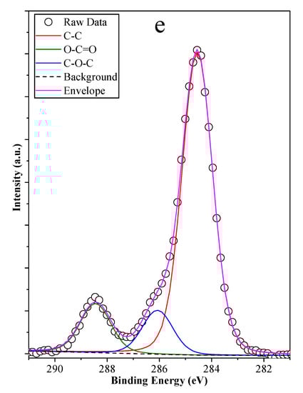 C1s XPS spectra (Figure 14c–e) of the above-mentioned samples were analyzed, and three carbon species/bond types were identified: C–C at 284.5 eV, C–O–C at 286.0 eV, and O–C=O at 288.6 eV. As the hollow nanostructures were obtained by the removal of carbon, the presence of oxidized carbon was not a surprise. However, in sample H2_HS_5, the amount of oxidized carbon was higher (15.19%) than in H2_HS_2 (7.72%) and H2_HS_6 (12.38%). The more pronounced presence of oxidized carbon in the most efficient H2_HS_5 sample points out that the removability of carbon spheres was higher in this case, which is also reinforced by the lower content of total carbon (8.91 at%, compared to sample H2_HS_2—20.18 at% and H2_HS_6—30.72 at%). The presence of carbon at such concentration values is known, even without applying additional carbon source, as the authors have shown in a paper [63].