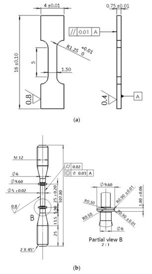 Specimen dimensions: (a) miniaturized sheet specimen with a length of 16 mm; (b) standard creep specimen with a rod shape and a 108 mm length.