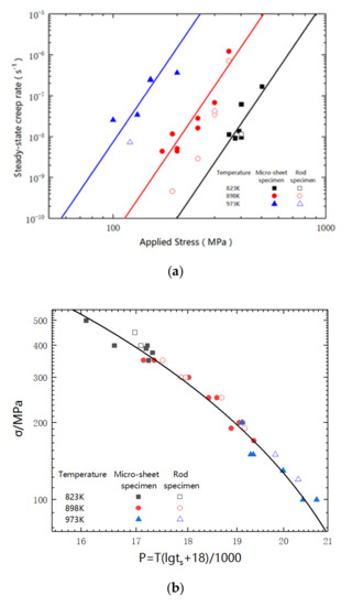 Although lgσ and lgtr preferably meet a linear relation in the presented data, it has been reported that this method is not faithful to be applied to long-term extrapolating in a wide stress range [18,20]. A great number of experimental data [19,20,21,22] indicated that the steady state creep rate plays an important role in the creep life.