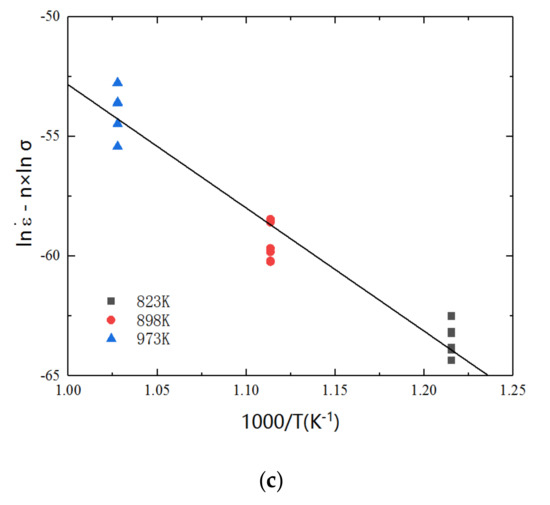 Based on the experimental data, the values of are calculated and plotted in accordance with the 1/T in Figure 3c. By fitting the data, the slope can be calculated, and therefore the apparent activation energy, Qc, is decided as 428 kJ/mol. The obtained energy is obviously higher than the bulk diffusion activation energy (270 kJ/mol) and the boundary and pipe diffusion activation energy (159 kJ/mol) of γ-iron [23,29], but it is quite similar with that in other commercial alloys, such as 14Cr-15Ni-Ti (460 kJ/mol) [23], 316H (397 kJ/mol) [30], and 347SS (469 kJ/mol) [31]. The high level of the obtained activation energy is considered to be related with the precipitations in the commercial alloys.