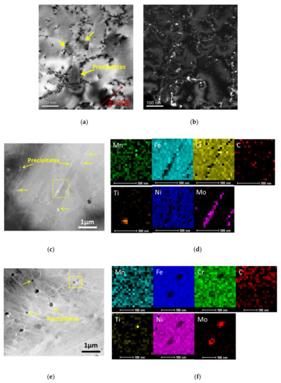 The TEM observations of precipitates in the creep-tested 15-15Ti are representatively presented in Figure 4a,b. Dislocation pile-up is found to surround the precipitates that verifies the interactions between the precipitates and dislocations during creep. The precipitates are more discernible under HAADF, as shown in Figure 4c. The EDS results of the 190 MPa-ruptured specimen reveal that the precipitates are enriched in Mo, but depleted in Fe, Cr, and Ni. In addition, the Mo-enriched precipitates tendentiously appear on grain boundaries.