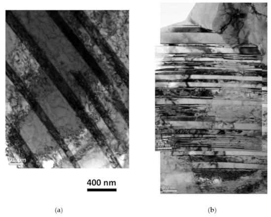 TEM observations of the deformation twins after creep tests of (a) 190 MPa and (b) 300 MPa.