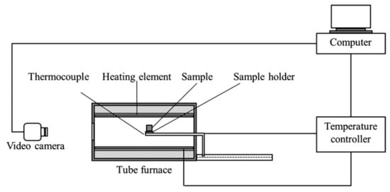 The characteristic temperature was measured using the LZ-III slag melting temperature characteristic tester(Northeast University, Shenyang, China) shown in Figure 1. The experimental method was as follows: (1) Weigh 10g of pre-slag and press the sample with a sample mold. The sample was a cylinder with a diameter of 3 mm and a height of 3 mm. (2) The prepared sample was placed in the LZ-III slag melting temperature characteristic tester. (3) With the temperature increased at a rate of 5 °C/min, the corresponding temperature was recorded as the softening temperature, hemisphere temperature and flow temperature, when the sample dropped to 75%, 50%, and 25%, respectively [,]. Throughout the process, 300 mL/min of Ar was used as the protecting gas.