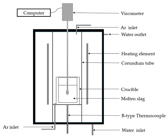 A diagram of the experimental apparatus used to take viscosity measurements is shown in Figure 3. This technique was widely used due to its relative simplicity and reproducibility []. The experiments were conducted in a corundum tube using the RTW-16 high temperature melt property tester (Northeast University, Shenyang, China). A B-type thermocouple and a proportional integral differential control system were used to maintain the target temperature. The experimental method was as follows []: (1) Weigh 130 g of pre-slag and press into a cylinder with a diameter of 30 mm and a height of 10 mm at a pressure of 20 MPa using a tableting machine. (2) Then place it in a corundum crucible with a diameter of 40 mm and a height of 120 mm. (3) 1.5 L/min of the high purity argon gas was injected into the tube to control the atmospheric conditions. The gases were passed through soda lime to remove excess moisture. (4) Place the crucible into the RTW-16 high temperature melt property tester in the hot zone of the furnace and the temperature of the hot zone was controlled to 1500 °C and was maintained for 1 h to achieve thermal equilibrium of the slag. (5) During the cooling process, the slag viscosity was measured by the rotational torque method. After the spindle was placed in the slag, the viscosity was measured by lowering the temperature at a rate of 5 °C /min. The rotational speed of the spindle was fed back to the computer and the viscosity value was continuous recorded until it reached the range of 2.5~3 Pa·s. It should be noted that, because the pure Ar gas was blown, the low oxygen partial pressure was maintained and most of the Fe would be present as Fe2+. The temperature was calibrated before each experiment using a B-type thermocouple inserted from the top of the reaction tube. Castor oil was used as the material for calibration before the viscosity measurements.