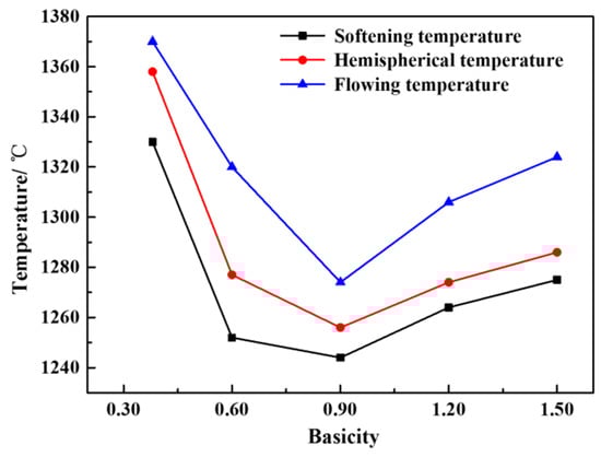 Figure 5 shows the effect of basicity on the characteristic temperature of a CaO-SiO2-FeO-MgO system. It can be seen from the figure that when the basicity is 0.38~1.50, the softening temperature, hemisphere temperature and flow temperature of the slag system decrease first and then increase with the increase of basicity. When the basicity is 0.90, the softening temperature, hemisphere temperature and flow temperature are all the lowest, which are 1244, 1256 and 1274 °C respectively. The reason is analyzed as follows. When the basicity is 0.38~0.90, with the increase of basicity, CaO destroys the network structure of the olivine phase, resulting in the olivine phase gradually disintegrating [,]. The effect of CaO is conducive to the lowering of the liquidus temperature of the slag system, as the softening temperature, hemisphere temperature and flow temperature are also reduced. When the basicity is 0.90~1.50, CaO itself has a high melting point and is easy to combine with other components in the slag system to form the high melting point substance, so that the liquidus temperature, softening temperature, hemispherical temperature and flow temperature of the system are gradually increased. The flow temperature is significantly higher than the softening temperature and the hemispherical temperature, resulting in the deterioration of fluidity.