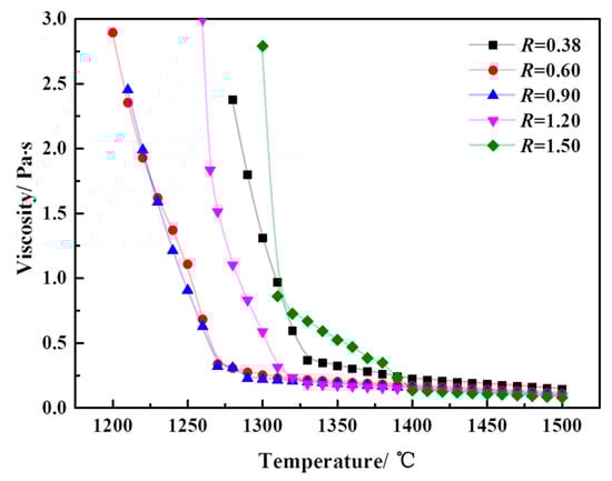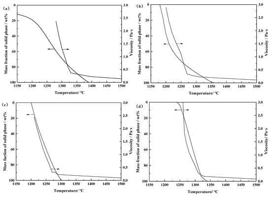 Figure 11 shows the effect of solid precipitation in the modified slag system on viscosity of the slag. Because the viscosity of the slag is affected by the contents of solid phase and liquid phase at high temperature, and the former is more significant []. When the slag system continues to cool below the liquidus temperature, the solid phase can be precipitated because of the saturation as the temperature decreases and continue to be formed. At this time, the viscosity of the slag will increase rapidly. The formation rate of the solid phase is smaller when the temperature is higher than the critical viscosity temperature of the slag system. By contrast, the formation rate of the solid phase is significantly increased when the temperature is lower than critical viscosity temperature.