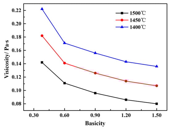 Figure 7 shows the effect of basicity on the viscosity of the CaO-SiO2-FeO-MgO system at different temperatures. It can be seen from the figure that the viscosity of the slag system gradually decreases with the increase of basicity when the slags are all above the liquidus temperature (1400~1500 °C). At the same basicity, the viscosity of the slag is gradually reduced with the increase of temperature. At 1500 °C, when the basicity increases from 0.38 to 0.60, the viscosity decreases rapidly from 0.14 Pa·s to 0.11 Pa·s. When the basicity increases from 0.60 to 1.50, the viscosity decreases slowly from 0.11 Pa·s to 0.08 Pa·s. With the increase of basicity, the trend of viscosity reduction is consistent when the temperature is in the range of 1400~1500 °C.