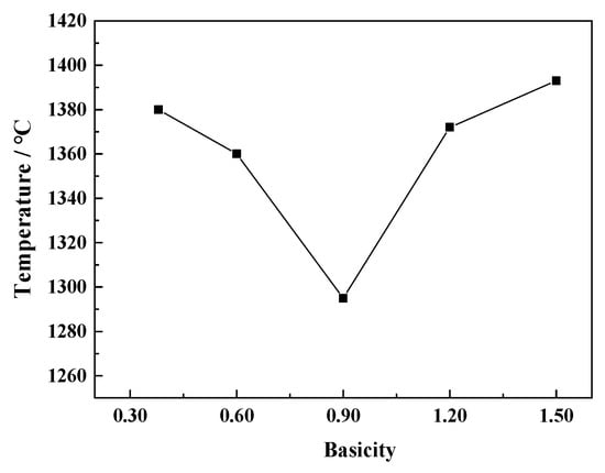 Figure 9 shows the effect of basicity on the critical viscosity temperature of a CaO-SiO2-FeO-MgO system. It can be seen that critical viscosity temperature of the slag system decreases firstly and then increases with the increase of basicity at the range of 0.38~1.50. And critical viscosity temperature is the lowest, which is 1295 °C at the basicity of 0.90. In order to ensure the migration of components in the slag and strengthen the dynamic conditions of the reaction, a lower viscosity and good fluidity of the slag system at the smelting temperature range is beneficial to the process of metallurgical production. So it is necessary to reduce critical viscosity temperature of the slag system.