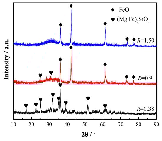 Figure 10 is the XRD (X-ray Diffractometry) patterns of the CaO-SiO2-FeO-MgO system by water quenching at 1290 °C. It can be seen that the primary crystal phase precipitated from the slag system is FeO (monoxide) when the basicity is 1.50, and (Mg,Fe)2SiO4 (olivine) when the basicity is 0.38. At the basicity of 0.90, FeO and (Mg,Fe)2SiO4 exist simultaneously. The experimental result is in agreement with the phase diagram analysis results.