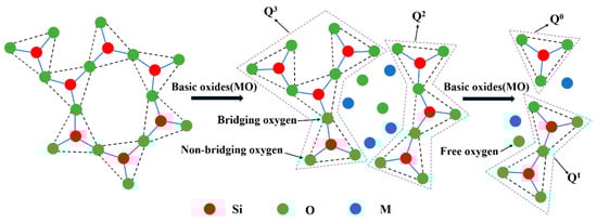 Figure 12 shows the schematic disintegration of the silicate structure by basic oxides. There are three types of oxygen in the molten slag, shown as follows []. (1) Bridging oxygen (O0, the oxygen atom is connected to two silicon atom). (2) Non-bridging oxygen (O−, the oxygen atom is connected to a silicon atom). (3) Free oxygen (O2−, the oxygen atom is not connected to the silicon atom). With the addition of basic oxides, free oxygen will enter the silicate system and destroy the bridge oxygen bonding in the silicate structure. Thereby the complicated silicate network structure becomes a simple silicate structure and a large number of non-bridged oxygen forms. For example, the main structure of [Si3O9]6− combines with the free oxygen released by the basic oxide to decompose into a dimeric structure of [Si2O7]6− and a monomeric structure unit of [SiO4]4−, while the cation of the basic oxide will act as a balancing charge. Q3, Q2, Q1, and Q0 indicate that the number of bridge oxygens connected to each silicon atom is 3, 2, 1, and 0.