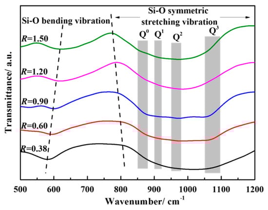 Figure 13 shows the FT-IR spectra of water quenching slag sample at 1500 °C. The [SiO4]4− tetrahedron symmetric stretching vibration zone is in the range of 800~1200 cm−1, the four kinds of Si-O zones are in 1100~1150 cm−1 (Q3, layered), 950~980 cm−1 (Q2, chain), 900~920 cm−1 (Q1, dimer), and 850~880 cm−1 (Q0, monomer) [,]. It can be seen from the figure that as the basicity increases from 0.38 to 1.50, the center position of the [SiO4]4− tetrahedral symmetric stretching vibration zone gradually shifts to the low wavenumber region and the valley depth of the [Si-O] bending vibration zone is gradually reduced. At the same time, the valley depth corresponding to the central position of Q0 is gradually deepened and the valley depth corresponding to the central position of Q3 is gradually shallower, but the valley depth corresponding to the central position of Q1 and Q2 is not obvious. It indicates that CaO as a network modification gradually destroys the complex network structure of silicate into a simple dimer (Q1) or monomer (Q0), which leads to the continuous decrease of the polymerization degree of silicate.