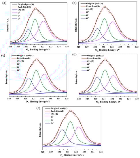 The XPS peak fitting spectrum of O1s in water quenching slag sample at different basicities: (a) R = 0.38; (b) R = 0.60; (c) R = 0.90; (d) R = 1.20; (e) R = 1.50.