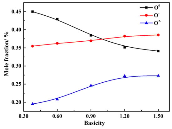 Figure 15 shows the effect of basicity on the mole fraction of different oxygen atoms in CaO-SiO2-FeO-MgO water-quenched slag samples. It can be seen that when the range of the basicity is 0.38~1.50, the molar fraction of O0 decreases with the increase of basicity, and the mole fraction of O− and O2− increases continuously. The molar fractions of O0, O− and O2− changed significantly at the basicity of 0.38~1.20. But the molar fractions of O0, O− and O2− are almost unchanged when the basicity continues to increase to 1.50. It is shown that with the increase of basicity, the silicate network structure is gradually depolymerized into simple monomers, resulting in the degree of polymerization being reduced, and the viscosity gradually reduced, which is consistent with the results of the FT-IR spectra analysis. At the same time, it also explains the reason for the viscosity decreasing gradually with the increased basicity in Figure 7 from the level of microstructure.