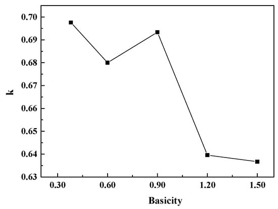 Under equilibrium conditions, an equilibrium constant k may be written according to Equation (2) []. The curve of k with basicity of the CaO-SiO2-FeO-MgO system is as shown in Figure 16. It can be seen from the figure that the mole fraction of different kinds of oxygen atom converges to a constant value when the basicity is above 1.20.