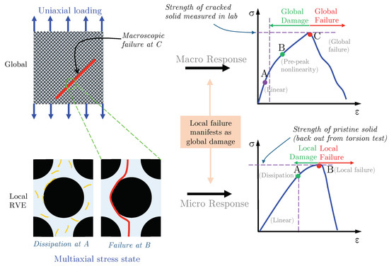 Qualitative behavior of the fiber matrix specimen (global) under uniaxial loading in contrast to behavior of fiber-matrix (local) constituents at the micro-scale.
