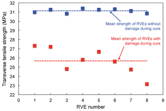 Our prior work (D’Mello et al. [10]) on transverse loading of virtually cured randomly packed unit cells indicates that packing has a strong influence on transverse tensile strength (Figure 4). However, in this investigation, apart from influence of unit cell size, we also aim to find the influence of randomness in fiber packing and matrix fracture properties under transverse tension. Under tension, the crack band model described in the next section, will be used to model damage/failure propagation in the unit cells. The output from these simulations will provide transverse tension fracture properties—that is, unit cell strength and fracture toughness. Next step in the analysis is finding correlation between unit cell size (for a given fiber volume fraction) and the fracture properties and quantifying randomness associated with fracture properties. As shown in Figure 4, taken from D’Mello et al. [10], the effect of curing has a marked influenced on the unit cell strengths. This behavior is due to the presence of inherent self-equilibrating residual stresses in the unit cells on account of curing. When such unit cells are loaded in the transverse direction, the overall strain required for the matrix elements to enter failure is much lower. Moreover, the global stress recorded is also lower due to account of pre-existing tensile residual stress in the matrix.